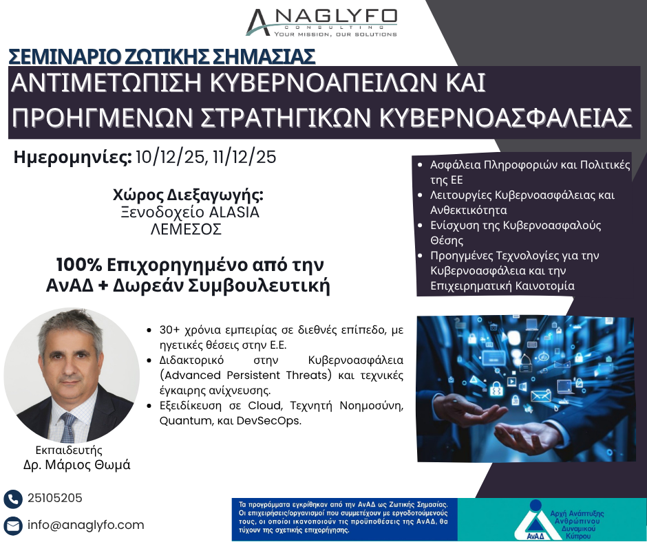 Σε έναν κόσμο όπου η τεχνολογία εξελίσσεται ραγδαία, οι κυβερνοεπιθέσεις αποτελούν μια διαρκώς αυξανόμενη απειλή για τις επιχειρήσεις. Τώρα, περισσότερο από ποτέ, είναι επιτακτική η ανάγκη να εξοπλιστείτε με τις απαραίτητες γνώσεις και εργαλεία για την πρόληψη, την αντιμετώπιση και την ανθεκτικότητα απέναντι σε τέτοιες προκλήσεις. Η Anaglyfo Consulting Ltd, με πολυετή εμπειρία στην επαγγελματική ανάπτυξη και ενδυνάμωση, σας δίνει την ευκαιρία να συμμετάσχετε σε ένα μοναδικό πρόγραμμα κατάρτισης «Αντιμετώπιση Κυβερνοαπειλών μέσω Σύγχρονων Τεχνολογικών Λύσεων και Προηγμένων Στρατηγικών Κυβερνοασφάλειας», επιχορηγημένο 100% από την ΑΝΑΔ.