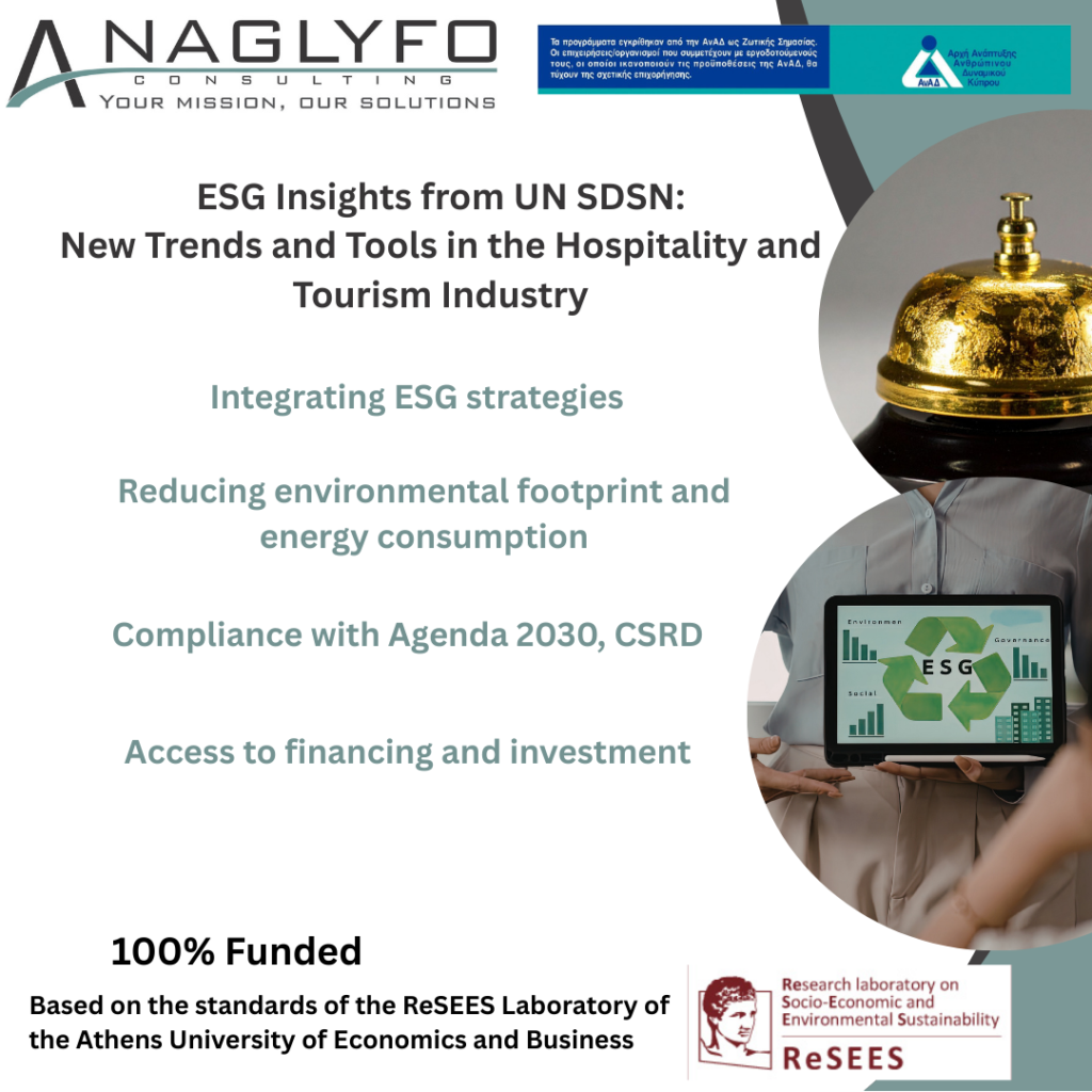 The seminar “ESG Insights from the UN SDSN: New Trends and Tools for the Hospitality and Tourism Industry” brings to Cyprus the latest directions of the UN Sustainable Development Solutions Network (UN SDSN) and is based on the thematic and standards of the ReSEES Lab of the Athens University of Economics and Business. Designed specifically for tourism and hospitality professionals and executives, the seminar presents not only the latest international trends, but also new, practical tools that you can immediately apply to your business.